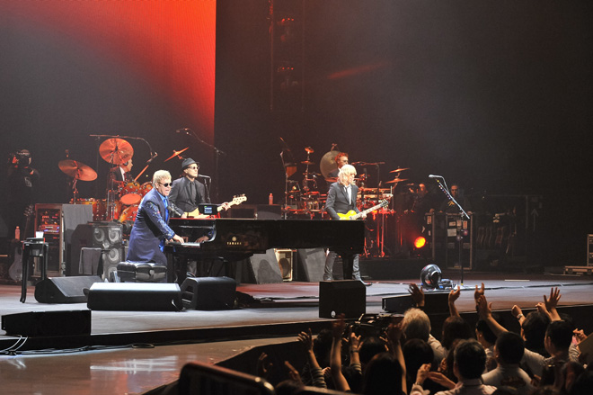11月18日、横浜アリーナにてエルトン・ジョンを観た。彼の来日公演を観るのは2007年11月以来ということになるが、その際の日本武道館での二夜公演は彼自身のピアノの弾き語りによる完全なソロ・ライヴであり、今回のような“エルトン・ジョン&ヒズ・バンド”としての来日は2001年以来ということになる。そしてまず結論から先に言ってしまうと、まさに至福の時間というべき素晴らしいひとときだった。同16日に行なわれた大阪城ホール公演を、あるいはこの横浜公演の模様をWOWOWでの生中継を通じて見届けたという読者も少なくないはずだが、おそらく誰もが満足以上のものを味わったに違いない。