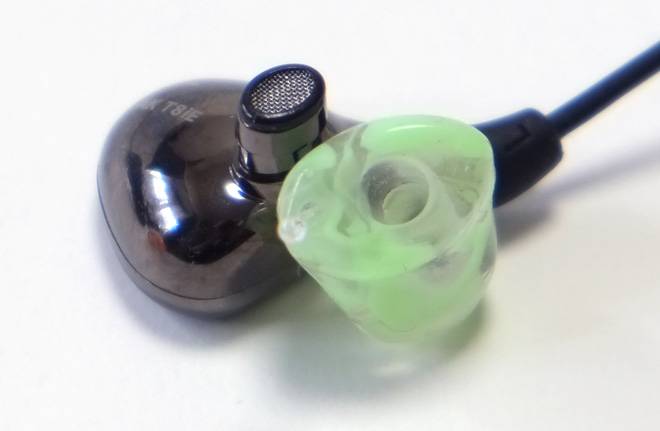 ▲UM56のノズル穴の大きさはオーダー時の指定によって異なるため、全てのUM56でうまく装着できるわけではないので注意。私はUE 10プロ用として作ったものでジャストサイズだった。ご覧のとおりT8iEのノズル断面は独特な楕円形をしている。