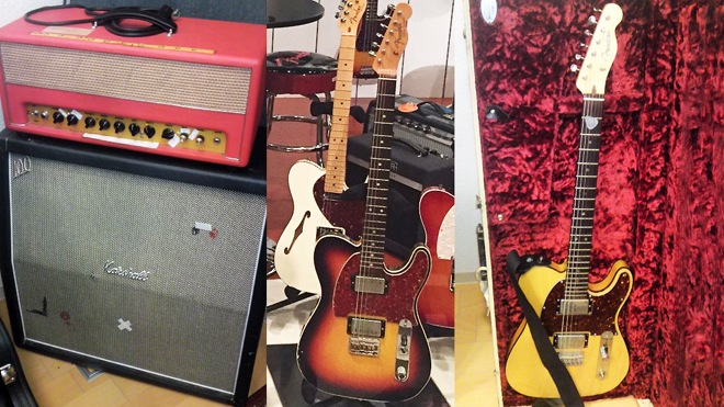 2ハムのテレキャスターということで、レスポールとストラトの合いの子みたいな音がする超個性的なギター。他で似た音のギターを聴いた事も無く、換えが全く効かないので誰かに壊されたり盗難されたりが心底怖い。ツアー中も機材車に置きっぱなしにせずに必ず部屋に上げる。スタッフはじめ、他人に持たせることも基本的にはない。昔は「こいつは俺の体の一部だから」みたいに言っちゃうミュージシャンのことが大嫌いだった。しかし、今や喉の奥にその類いの言葉がスタンバってる自分に気づく。仕様がない、色んな場所で色んな経験を一緒にしてきた大事なギター、もうこいつらは僕の体の。僕はギタリストだ。