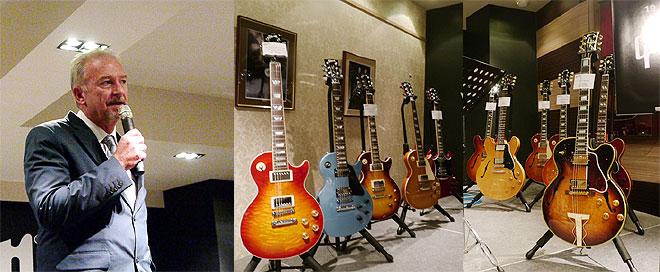 ▲Gibson USA/MemphisジェネラルマネージャーのDavid Winters氏と、壇上に並べられたGibson USA、Gibson Memphisの2016年モデルの一部。