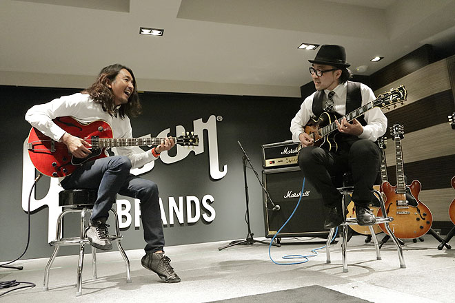 数多くのモデルが紹介された後、ゲストとしてJiLL-Decoy associationのギタリストkubotaさんが登場。2016年モデルを試奏して、多くの気に入ったモデルがあったという中からまず挙げたのが、ボディの薄さと形とフルアコだということに惹かれたというES-275F。フルアコはハイポジションが弾きづらいと苦手意識があったが、「これは弾きやすい」「自分のプレイスタイル的にありがたい、音もセミアコっぽい鳴り方もしながら、ちゃんと箱の感じもディープに出てくるのがすばらしい」とコメント。「どう見てもLes Paul、まさかこれの中が空いてるとは誰も思わない」というES-Les Paul Standardでジャジー&メロウなサウンドからタイトなカッティング、歪みまで多彩なサウンドを聴かせた。