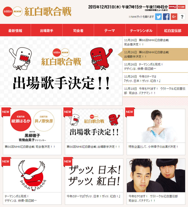 また、司会者も同時に発表された。紅組の司会は綾瀬はるか、白組の司会は井ノ原快彦(V6)が担当。総合司会は、黒柳徹子とアナウンサーの有働由美子だ。