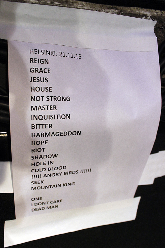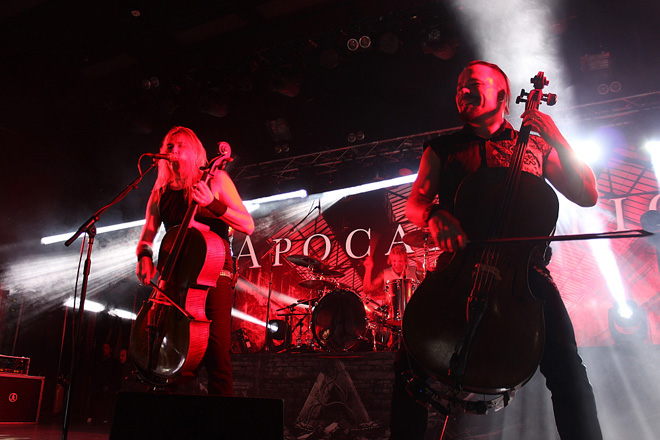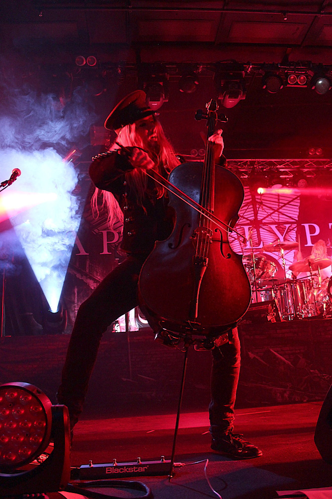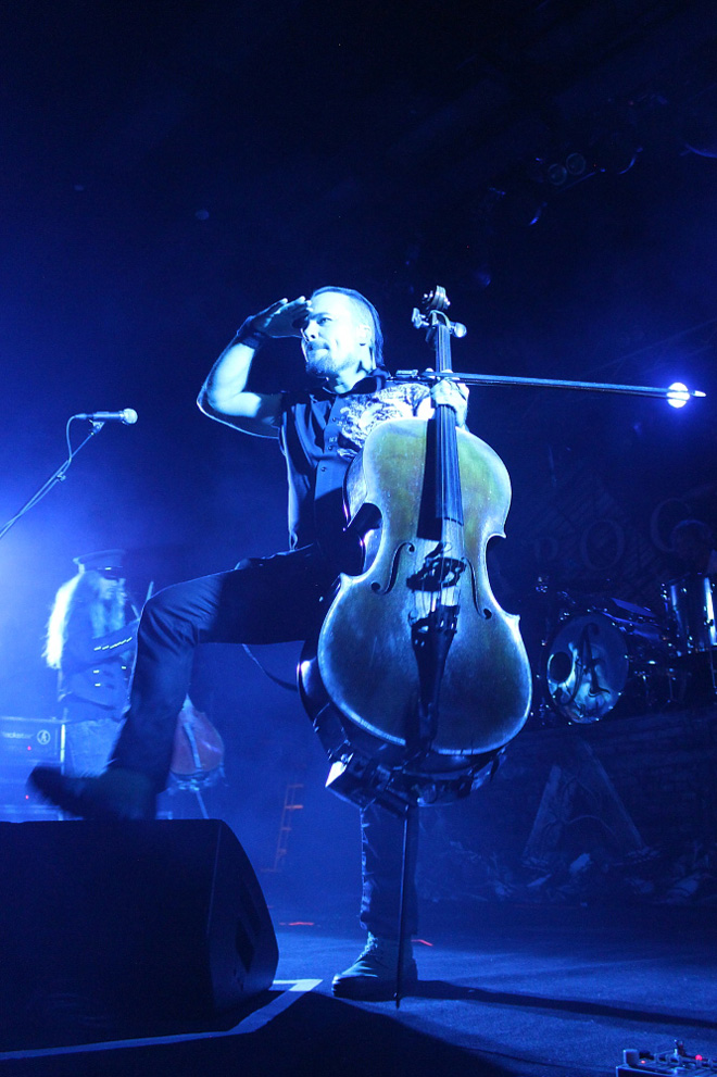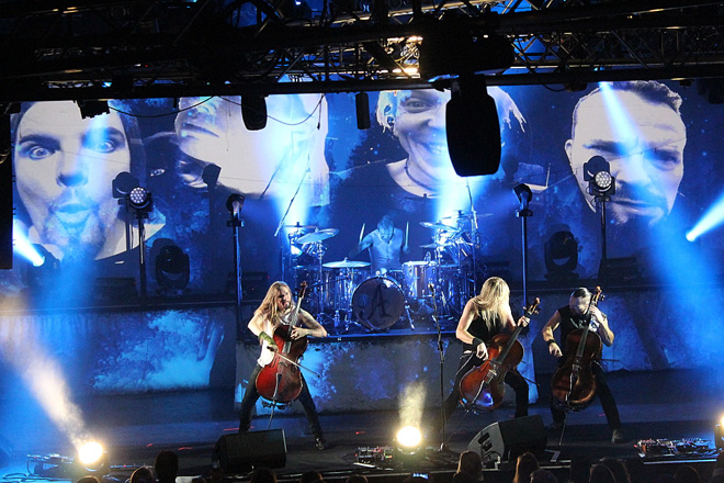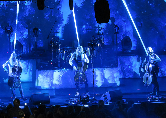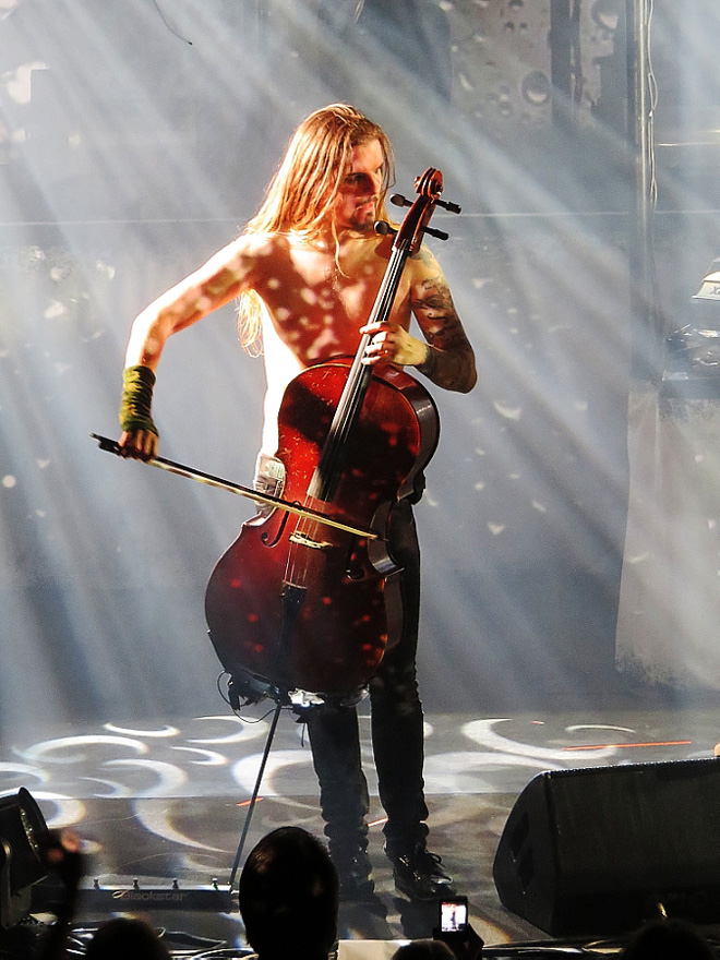 知らない方はチェロでメタル?と思うかもしれないですが、Mikkoのドラムが加わるとこれがすごく迫力あるのであります。そしてなんといってもチェロの音色が美しい!今回Frankyのヴォーカルがどうなんだろうと思ってましたが、バンドに溶けこみApocalypticaとして、特に違和感なく楽しめました。アルバムではHIMのVille Valo(ヴィッレ・ヴァロ)とThe RasmusのLauri Ylönen(ラウリ・ウロネン)がヴォーカルの「Bittersweet」は2人のヴォーカルのインパクトがかなり強いのでどうだろうと思ったのですが、これはヴォーカルなしのインストゥルメンタルで演奏。それで正解だったと思いました。彼らのショーはステージの演出にもこっていて、途中で後ろの壁に掛かっていたバンド名が書かれた幕がおち、その後は映像がステージに映し出され、アングリーバードのテーマ曲ではアングリーバードになったメンバーのおかしな顔が飛びかったり、ステージが炎で包まれたり、水滴がちりばめられたり、照明と映像、そしてApocalypticaのサウンドが合体!見ごたえ、聴きごたえたっぷりの素晴らしいショーであっという間の2時間でした。