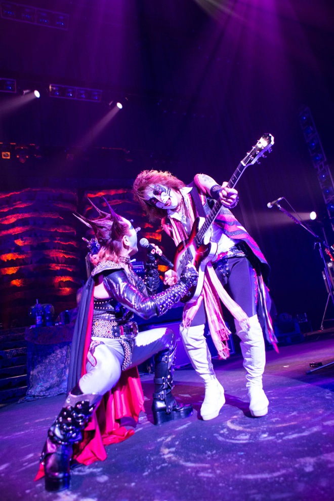 風の音が聞こえ、ギターの低く怪しい音が響く。デーモン閣下が英語で「Deep inside the forest〜」と語り始めた。その言葉に続きゼノン和尚が「悪魔の森の奥深く〜」と日本語訳をつけてくれる。暗く怪しげな場内、閣下と和尚の絶妙なやりとりで客席が笑いに溢れる。「蝋人形の館」への導きの儀式である。