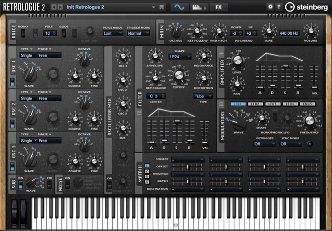 バーチャルアナログシンセサイザーは「Retrologue 2」に進化。3つ目のオシレーター、ポリフォニックLFO、エンベロープの追加など基本性能の刷新に加え、32ステップのアルペジエーターとRESONATER、EQ、PHASER、MOD FX、DELAY、REVERBといったエフェクトも装備する。