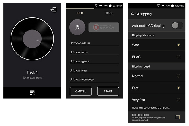 操作自体は極めてシンプルで、ファイル形式(WAV/FLAC)とリッピング速度(Normal/Fast/Very fast)の選択となり、「オートマティックCDリッピング」をONにすれば、対応AKプレーヤーの通知バーにあるアイコンをタップするだけでリッピングがスタートする。