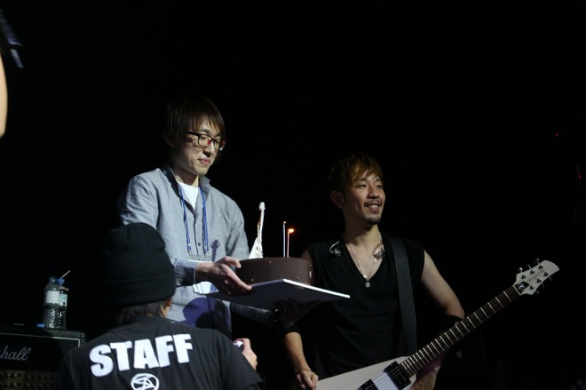 アンコールに応えて、再び4人がステージに姿を現すと誕生日を間近に控えたUZへのサプライズが。韓国語版「ハッピーバースデイ」に合わせ、UZのトレードマークでもあるフライングVがデコレーションされたピック型ケーキが運び込まれ、一足早い誕生日を祝った。