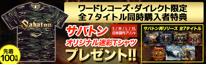ワードレコーズダイレクトで7タイトルを購入すると、先着でロックTV特製「サバトン・迷彩色Tシャツ」がプレゼントされる。各サイズが用意されているが、先着100名限定で終了となるものだ。ぜひチェックを。