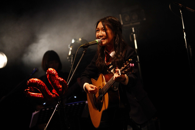 会場は平日ということもあり、半分以上が制服の女子高生だ。「大切な君へ」「だいすき。」はもちろん、ライブでの人気曲「線香花火」や、毎回会場で泣く女子が続出する切ない片思いを歌った「赤いマフラー」を含む全15曲が披露された。途中、ツイキャスでTwitterにあがったリクエストに応えて歌うリクエストコーナーを実施し、miwa「Don’t cry any more」、いきものがかり「プラネタリウム」、クリープハイプ「左耳」、サスケ「青いベンチ」の4曲が披露された。パソコンでコード譜を検索し即興で演奏するスタイルだが、通常のツイキャスでは直接会話する事ができないところ、ライブ会場だけにオーディエンスと会話しながらの楽しい時間となった。