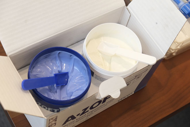 鼓膜の保護のために綿が挿入される。Aさんは、印象材という青と白の粘土のようなものを混ぜ合わせ、それを大きな注射器状の器具へ。顎を固定するために割り箸を縦に軽くくわえて準備完了。印象材の注入が始まった。まるでソフトクリームを巻くかのように印象材がぐるぐると耳の中に入ってくる。ひやりとするほど冷たくはなく、かと言って温かいというわけでもない物質で両耳が満たされた。周りの会話は一切聴こえなくなったが、店内に流れるBGMだけが響いてくる。とても不思議な感覚だった。1分ほどで、プチプチという気泡の破裂音が小さく聴こえ、固まり始めているのかなあとわくわくする。ほんの少し時間を置いた後、Aさんが固まり具合を確認して耳型になったそれを一気にぐるんっ!と引き抜いた。「編集長!これ、抜かれるとき、うわあ!!ってなります!」と謎の報告をしてしまうほどの、なんとも言えない感覚だった。ちなみに、ここまでで痛みは一切無い。
