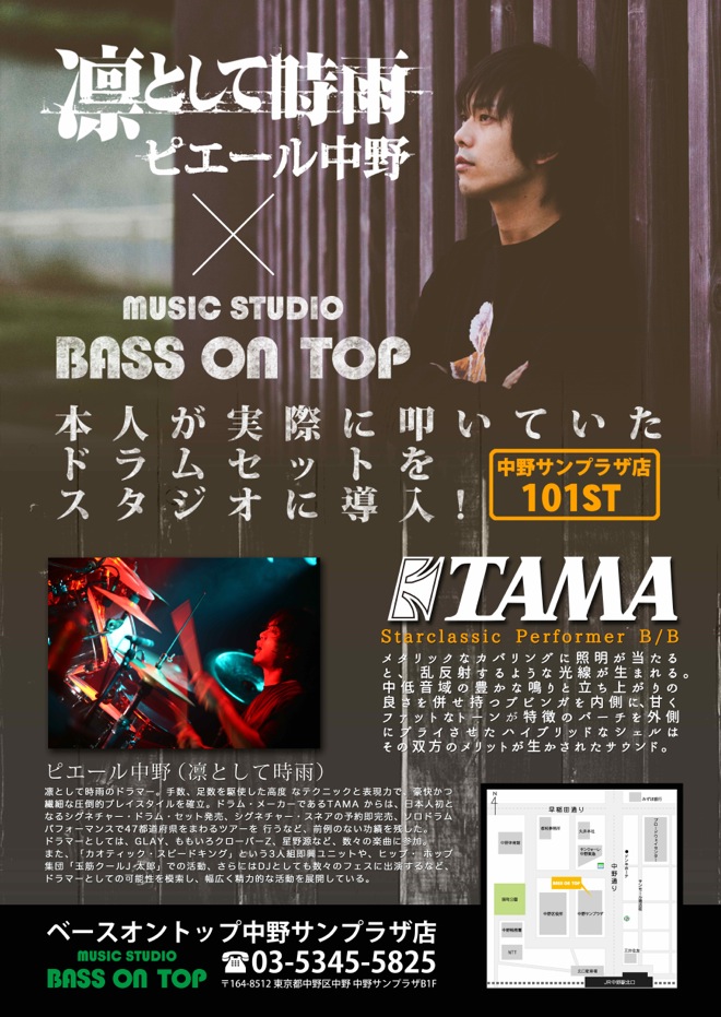 ドラムがセッティングされているスタジオは、BASS ON TOP中野サンプラザ店だ。ドラムセットはTAMAのStarclassic Performer B/Bで、ピエール中野が直々にチューニングを施しているとのこと。また、スネアには“ピエール中野シグネチャースネアドラム第二弾”が準備されているなど、ピエール中野色に染まったスタジオとなる。今後、シンバルやキックペダルも、ピエール中野と同じモデルが用意されていく予定とのことだ。