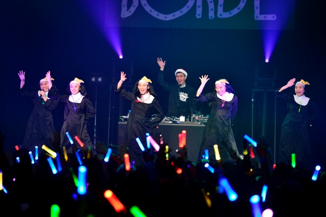 チームしゃちほこは、クリスマスのミサのような雰囲気の中、シスター風衣装で登場。「unBORDEクリスマスが始まるよー!Zepp Tokyo、メリークリスマス!」、「盛り上がっていけるのかー!」とフロアを煽ると、「ザ・スターダストボウリング」でオーディエンスのテンションは一気に沸点へ! その後もゲスの極み乙女。/indigo la Endの川谷絵音が提供した「シャンプーハット」や、 RIP SLYMEのカバー「JOINT」など、レーベルのイベントならではの選曲を。「J.A.N.A.I.C.A.」では作曲者であるtofubeatsを呼び込み歌って踊るレアなバージョンを披露した。ライブ後半では「そろそろ雪を降らせてくれてもいいんじゃね!?偉い人の竜馬―!」とレーベルヘッドを呼び捨てにしながらのおねだり(笑)。ラストの「抱きしめてアンセム」では、ヒートアップした会場に美しい粉雪が舞い降りた。