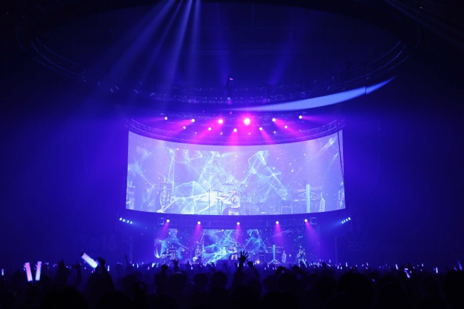 場内にアタック映像が流れると満員の客席に歓声が湧いた。SEにのってまずはメンバーがステージに上がり、続けて藍井エイルが登場。1曲目の「INNOCENCE」のイントロが流れると同時に、フロアが一気にヒートアップした。