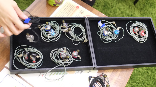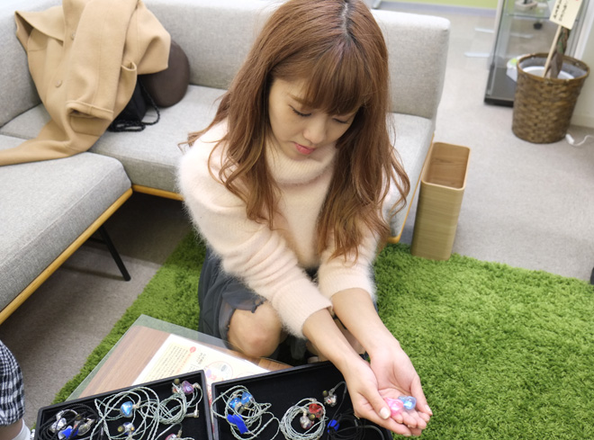 無事2人の耳型が採取されたところで、まずはモデルの選定だ。この日用意されていた試聴機はUE 4 Pro、5 Pro、7 Pro、11 Pro、18 Pro、Reference Monitors、Vocal Reference Monitor(Female)という7モデル。ユカフィン・ドールはいつも聞いているという乃木坂46と、サウンドチェックには最適なアフィリア・サーガで各モデルの音色をチェック、Pileは4つ打ちのキックがチェックしやすいというK-POPで視聴スタート。