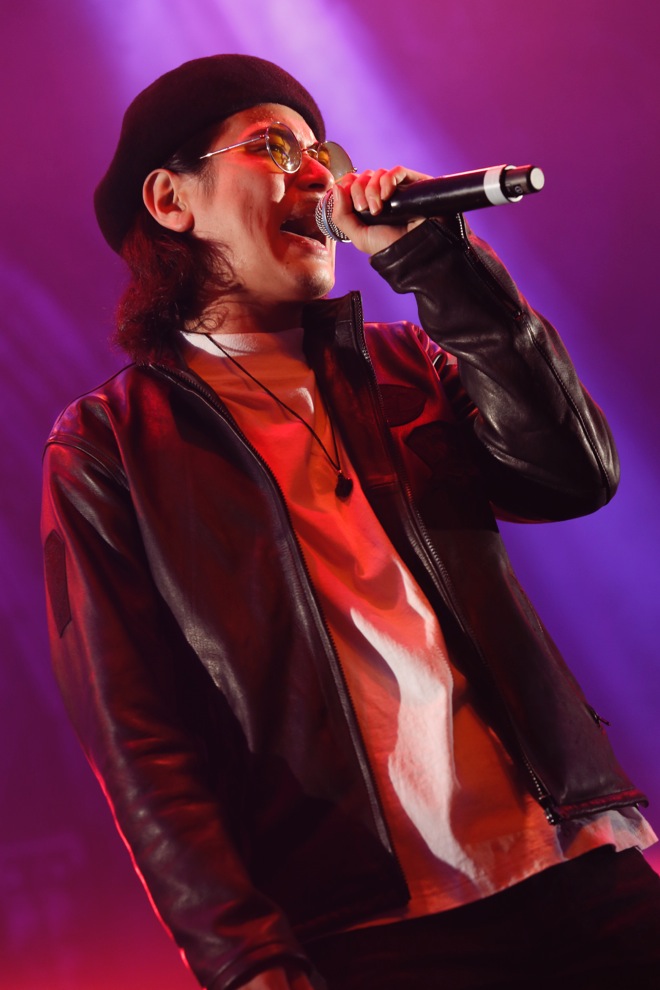 フロアからの大歓声が迫るカウントダウンが開演定刻の16:66(17時06分)を迎えると、Derailersがステージに登場した。Ju-kenのうねるベースとスリリングなAi Ishigakiのギターが絡むファンキーなオープニングセッションがオーディエンスの興奮を助長させたところで、Rueedが颯爽とステージに現れる。そして衝動的なラップを熱くブチかます1曲目の「重い空気に羽」へ。ベースラインを核としたシンプルながら有機的なアンサンブルが会場を震わせる。