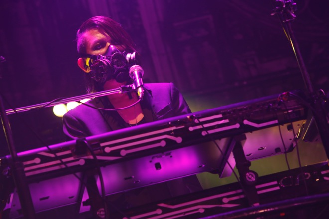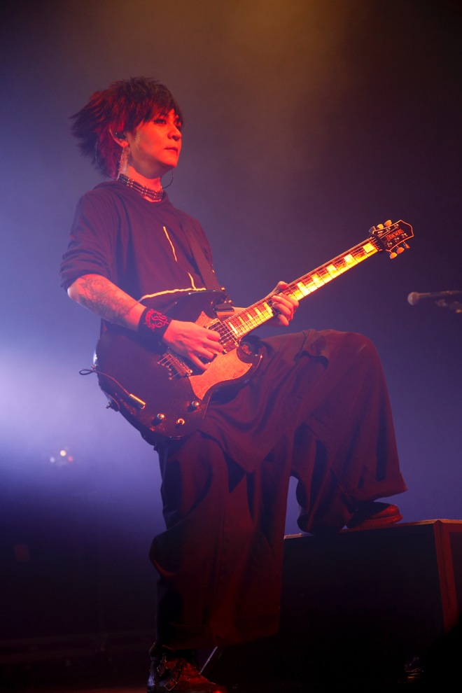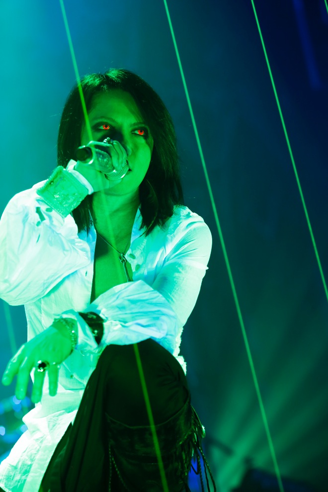 天井からステージへ、一直線を描く何本ものレーザー光線は禁断の領域との境目を印すものか。そこに漂うのはヒリヒリとした危うさだ。この日のオープニングは、「VAMPIRE DEPRESSION」から。HYDEの叫びに近い絶唱と切り裂くようにアグレッシヴなK.A.Zのギターに驚喜したフロアが渾然一体となり、早々にバリアが決壊、会場全体がサンクチュアリとなった。
