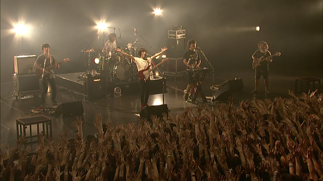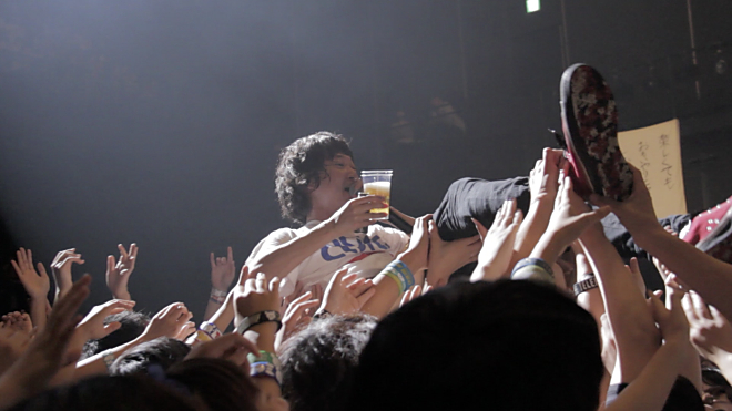 続く「DQNなりたい、40代で死にたい。」では、ヨコタ、カワクボ(Ba)、オカザワ(Gt )が、嬉しそうにステージを跳ね回り、『ヤンキーこーわい』の声が六本木の地下に響く。途中、「マイスピリッツを見せたい」とファンに支えられフロアの中央に足だけで立ったヤマサキは、「ライブに来てくれてありがとう。そして今、現実に支えてくれているあなたたちにもありがとう。バンドが売れたら遠くにいくとかしょーもないこと言うやつおるけど、今俺は物理的に近くにいる。近いやろうがー! どこが遠いんじゃー!」ヤマサキらしい最高の形でファンへ想いを叫んだ。そして完全なお祭り会場と化した「KMDT25」、「ハッピーポンコツ」で踊り続けたまま本編が終了した。
