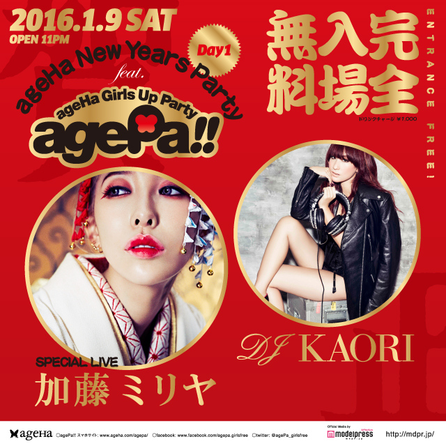 このイベントはageHaの新年一発目、DJ KAORIをレジデントにagePa!! ALL STARSのコラボレーションで、男女入場無料で行なわれるもの。地方などで来られないファンのために、26時頃からはイベントの模様が一部ライブ配信プラットフォーム『LINE LIVE』で生中継される。