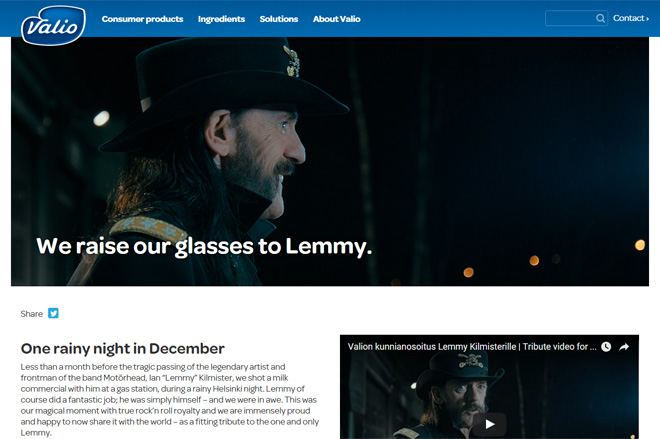 フィンランドの乳製品メーカーValioが、レミーが亡くなる数週間前に撮影された牛乳のコマーシャル映像を公開した。
