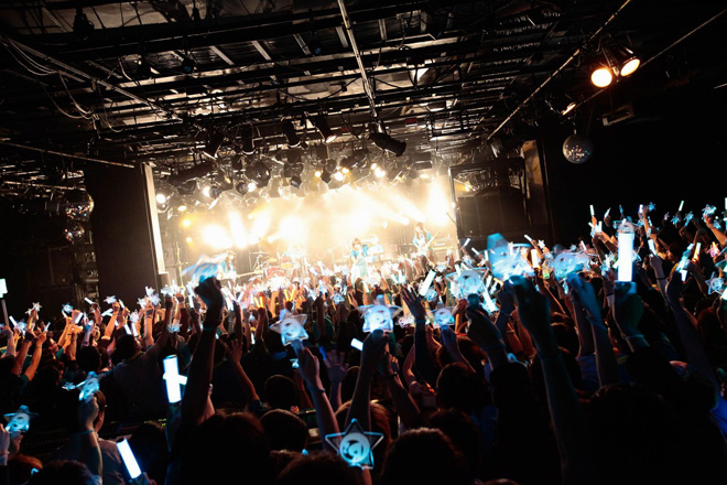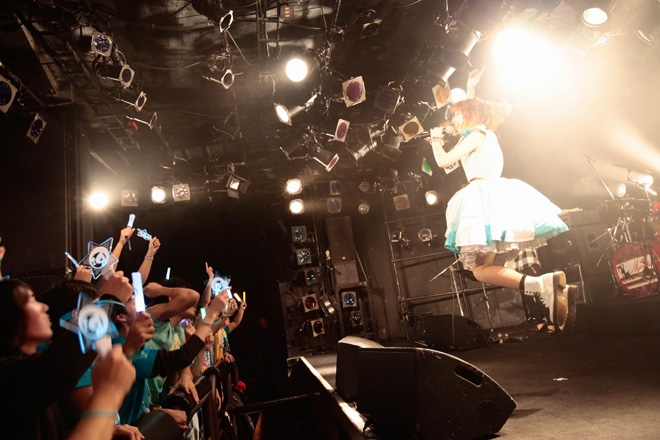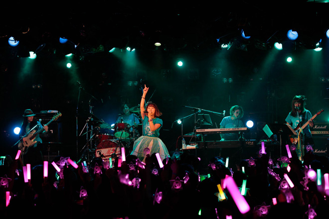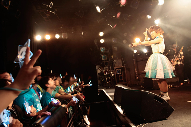 曲に合わせてグリーンのペンライトが灯った「Four Leaf Clover」を歌い終えたところで、「前回よりみなさんの熱がスゴい!」と言ってベストを脱ぐと、ノースリーブのトップスとふわふわターコイズブルーのスカートがよく似合う彼女に「回って見せて!」とオーディエンスからリクエストが飛ぶ。そのやりとりにしても、彼女のお茶目キャラが愛おしい。また、『紅白歌合戦』で、別アーティストのサポートをしていたベースのなかむらしょーこと遭遇していたことを明かした上で、トークで絡む相手にロックオン。サポートするガールズメンバーとも、だいぶ心の距離が近づいているようだ。