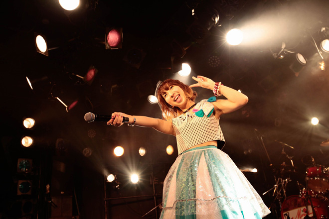 「こんにちは、そして明けましておめでとうございます、リッピーニューイヤーだね♪ 年明け早々、みんなに会えるなんて嬉しいです」と感激しつつ、クアトロ名物(?)の柱でステージが見えづらい人を気遣ったり、目に付いたオーディエンスをいじったり、声援にうまいこと切り返したりと、飯田里穂ワールド全開だ。前回の公演では初ソロステージということもあり緊張していたようだが、今回は楽しさのほうが勝っているらしい。何回か噛みながらも(それも微笑ましい!)、「前回はみなさんに勇気づけてもらったけど、今回は私がみなさんを楽しませます!」と宣言して、頼もしくもある。
