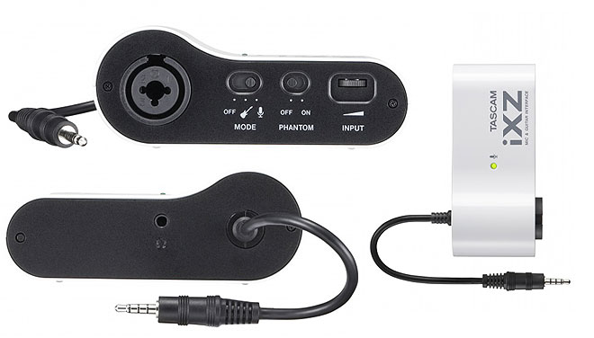 ▲TASCAMのiOSデバイス用マイク/ギターインターフェイス「iXZ」。iPhoneのマイク/イヤホン端子に接続して、マイクやギターの接続を可能にする。iOSとの接続ケーブルは直付け、コネクタは4極ミニプラグだ。