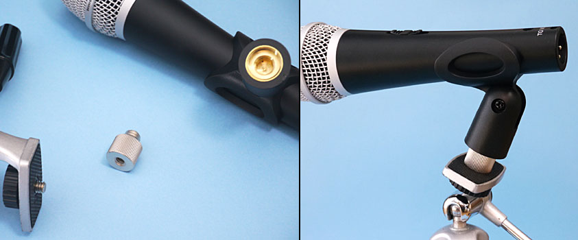 ▲写真左の中央が1/4インチのカメラ用三脚にマイクホルダーを接続するための変換ネジ。今回使用したマイクTG V30d s付属のマイクホルダーのネジ径は3/8インチなので、それに合った変換ネジを使用。マイクホルダーはこのほか5/8インチ径のものなどがある。写真右はカメラ用三脚-変換ネジ-マイクホルダーを接続した状態。