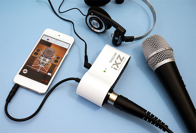 アコギを「いい音」で録る方法は、基本的に前回のボーカルと同じ。iPhone/iPad/iPod touchの内蔵マイクやイヤホンマイクではなく、ボーカル用や楽器用として売られているマイクを使うことだ。こうしたマイクはiPhone/iPadに直接つなぐことはできないので、オーディオインターフェイスが必要になる。というわけで用意したのが、ティアックのTASCAMブランドから発売されている「iXZ」という製品。価格は5,000~6,000円。マイクでの録音はもちろん、ギターもシールドケーブル1本で接続可能、キーボードなどのラインレベルの楽器にも対応するので、さまざまな録音が試せる。小さいながらもかなり使えるヤツなのだ。