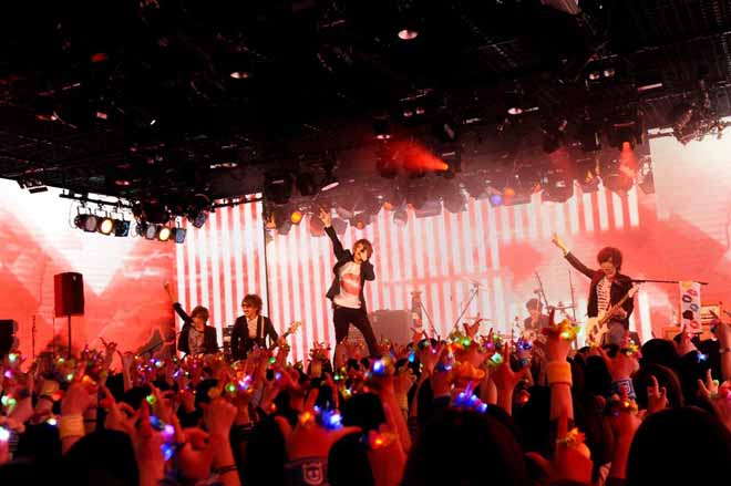 その中でもハイライトだったのは「4周年ライヴだけど、全曲やるわけにもいかないから……」ということで披露されたスペシャルメドレー。「君となう。」を皮切りに、初期曲の「愛と憎しみは紙一重」「嫌な奴ね、アンタ」「How much?」、5人ヴォーカルの「ごめんなさいっ!」などが組み込まれていて、ひたすら客席のテンションを上げ続けて行くメンバー達。そこからさらにTakeshiが先導を切る恒例の“ハナゲコール”をフィーチャーしたパーティーチューン「ハナゲの王様」になだれ込んだのだが、Takeshiがすさまじいテンションで「ハナゲぇ~」と叫ぼうとした瞬間に突如音が止まり、バラードナンバー「Turn Back Time」へ。メンバーにどっきりを仕掛けられたTakeshiが慌てまくるという場面も交えながら、ラストの「WE ARE KAMELEO!!」まで、全10曲をノンストップで繋ぐパフォーマンスを繰り広げた。