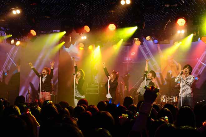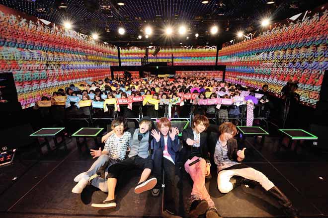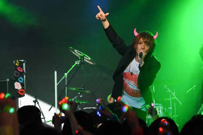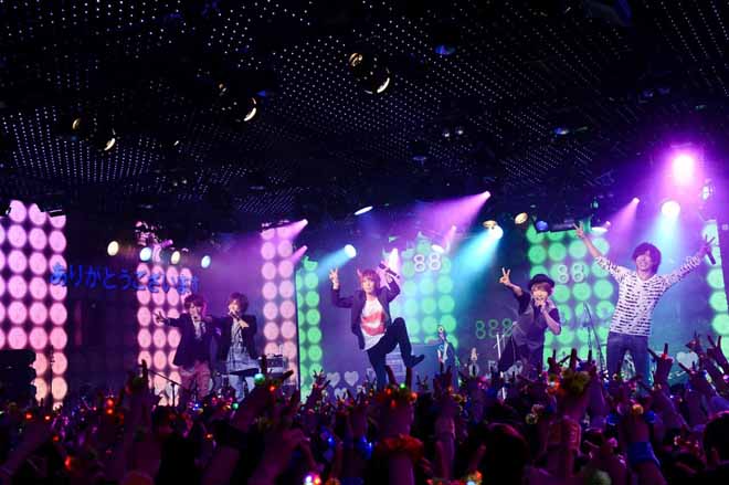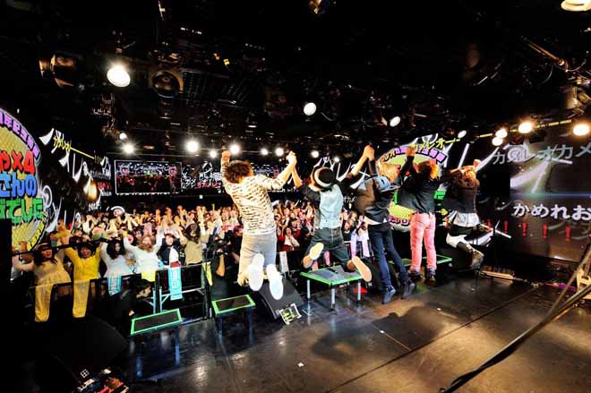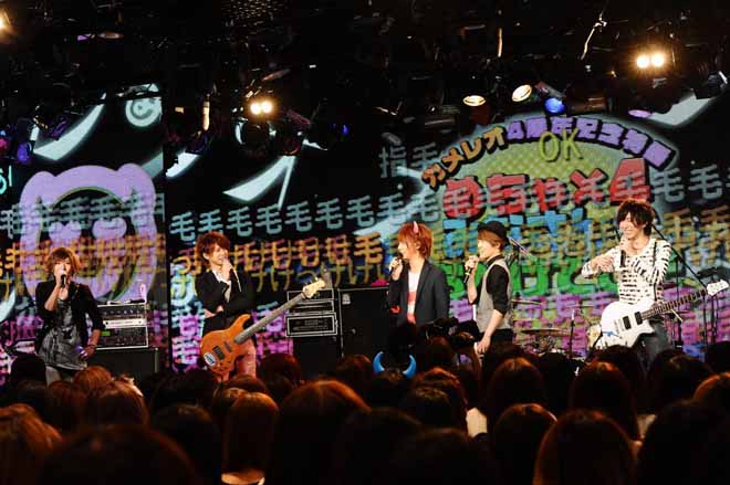 休憩中もレア映像を放送するというサービス精神を発揮しつつ、第2部となるライヴがスタート。黒のジャケットスタイルに着替えた5人は、“新年一発目、派手にいこうぜ! 初っ端からアホになっちゃってください!”と最新シングル「パリピポ」を披露。フロアをぐるりと囲むLEDビジョンやライティングも手伝って、瞬く間にド派手なパーティー空間を作り上げると、「デビルくん」では曲の途中で5人ヴォーカルにスイッチするなど、ライヴ冒頭からすさまじい熱気を巻き起こして行った。また「↑アゲていこう歌↑」では、第一部でユーザーから募集していた曲中に流したい顔文字(【(☝ ՞ਊ ՞)☝】(HIKARU.が“こうか君”と命名)が大量にコメントされていたが、あまりにも独特な表情の顔文字なため、メンバーが曲中で「腹立つー!」と絶叫。とはいえ、その表情はとにかく楽しそうで、ひたすら全力で駆け抜けて行く。