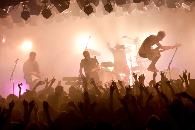 ツアーの初日となった渋谷クラブクアトロには、彼らのマジカルでハッピーなサウンドのトリコになったオーディエンスが大集結。開演前から、会場には割れんばかりの歓声や拍手が響くなか、4人が颯爽とステージに登場。フロントマンであるニコラスは、ピンクとグリーンで染められたヘア・スタイルにシルバーのシャイニーなジャケットを羽織り、宇宙からやって来たロックスターのようなイメージ。他メンバーも、顔にフェイス・ペイントをするなど、音に負けないカラフルなルックスで、「トーキョー、ゲンキデスカ!?」というかけ声とともにショーはスタート。日本デビュー盤であるセカンド・アルバム『トーキング・イズ・ハード』に収録された「ディファレント・カラーズ」など、勢いのある楽曲を立て続けに披露。すると観客は、両手を上げてダンスしたり、大合唱するなど、冒頭からクライマックスか?と思わせるほどの一体感・熱狂をみせていた。その興奮に、メンバーも刺激された様子で、ニコラスは「ミンナ、サイコー!」と何度もシャウト。またベースのケヴィンや、ギターのイーライ、ドラムのショーンも、サマソニで観たステージ以上に力強くエキサイティングなグルーヴを奏でていた。