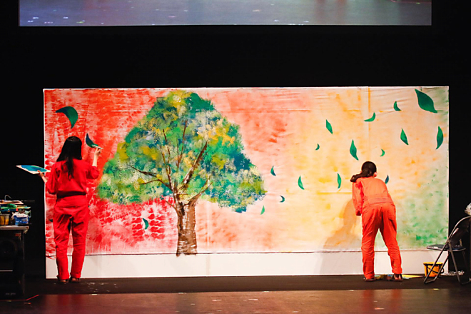 総合MCの上村、尾関に呼び込まれるとまずは小池美波、佐藤詩織が美術部として登場し、ステージに設置された大きな白いキャンバスにライブペインティングで絵を描くことに。2人がイベント中に絵を描いていく間、ステージではどんどんパフォーマンスが繰り広げられていく。