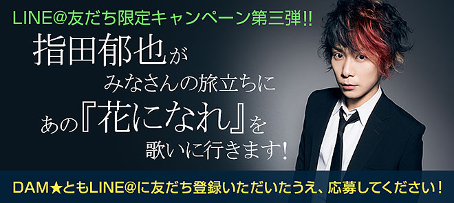 それぞれの旅立ち・出発に、指田郁也があの「花になれ」を歌いに行きます! そんな夢のようなプレゼントキャンペーンが、DAM★とものLINE@友だち限定で実施中だ。