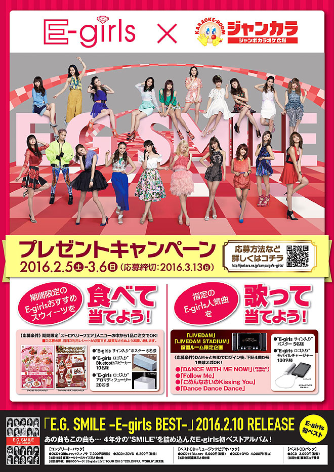 2月10日に初のベストアルバム『E.G. SMILE -E-girls BEST-』をリリースするE-girlsがジャンカラとコラボ、抽選でサイン入りポスターやロゴ入りグッズが当たる「E-girls×ジャンカラ プレゼントキャンペーン」が2月5日よりスタートする。