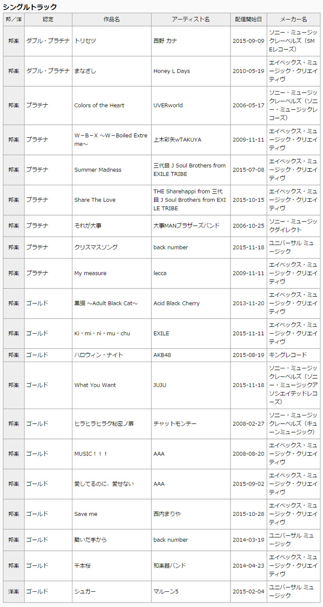 一般社団法人日本レコード協会から、以下のとおり、2015年12月度有料音楽配信認定作品が公表された。