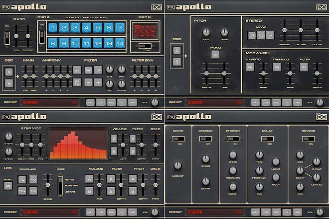 PXプロトタイプシリーズは、世に出ていないプロトタイプやレアなアコースティックまたはエレクトリック楽器のソフトウェア化を目指したもの。その第1弾となる「PX Apollo」のサウンドバンクは、70年代初期の世界最初のポリフォニックアナログシンセサイザーの1つであるApolloをベースとしたもの(ApolloはPOLYMOOGのプロトタイプとして開発されたが、発売はされなかった)。実機の温かみのあるサウンドをその稀有な質感とともに肌で感じることができる、3オシレーターのソフトウェアシンセサイザーとなっている。