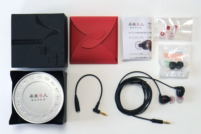 付属品:シリコン製イヤーチップ SpinFit S/M/Lサイズ (Mサイズは本体に装着)、Complyイヤーチップ T-200Mサイズ、L型接続コード、収納缶、クロス、取扱説明書兼保証書