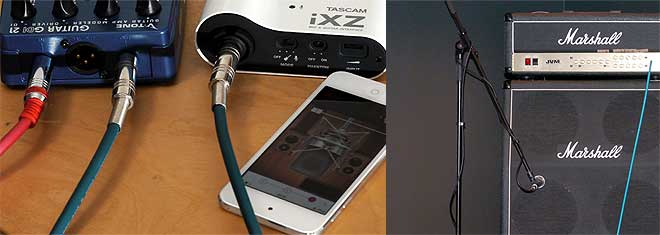 ▲エレキギターをアンプシミュレーター経由で「iXZ」に接続(右)。音作りは「iXZ」に入力する前の段階で行う。ギターアンプにマイクを立てて収録するには、角度を自由に変えられるブームマイクスタンドがほしいところ(右)。