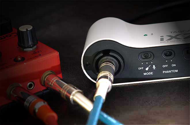 接続はいたってカンタン。「iXZ」をiPhoneのイヤホン/マイク端子に接続、MODEスイッチをギターに切り替え、エレキギターのシールドケーブルを「iXZ」の入力端子につっこむだけ。マイク使用時とは異なり、電池を入れる必要もない。なお、「iXZ」のINPUTボリュームはマイクプリアンプ用で、ギター入力時では使われない。必要なら入力前の段階で音量調整することになる。