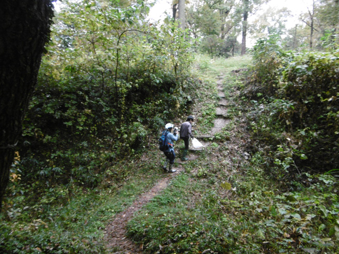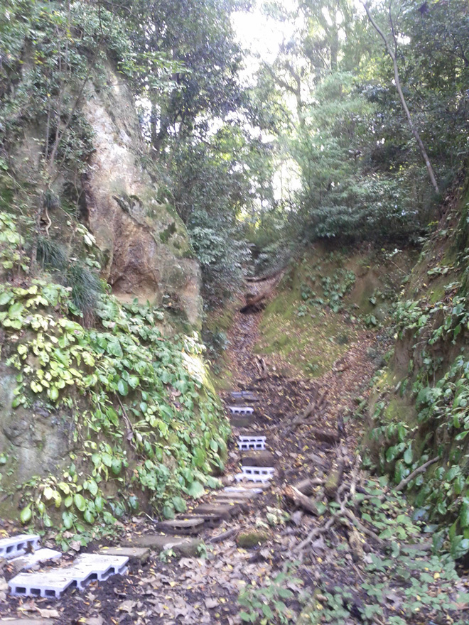 本曲輪を見学したら搦手に降りず、反対側の兵糧倉を通り、岩室観音堂の裏を見に行ってほしい。ここはこう見えて石を切った堀切である。もしかしたら天然でこの形をしており堀切の役目を果たしたのかもしれない。初めて来城した時に私は敢えてここを下から登らせてもらった。だがここはトレッキングに自信がないとかなり危ない。が、非常に楽しい。この横は惣曲輪となっており(今は民家の畑になっている)。土砂を運ぶブルドーザーが走った跡がある。この下が最初に車を停めてから歩いてきた道なのだが、私の推測だとこの下の道まで当時は川だったと思う。市野川の水流はこの真下まで来ていたと思うのだ。よってこの観音堂から横に惣曲輪までの道を歩くと堀切がたくさんあることがわかる、要は排水溝の役割を果たしてしたはずだ。一石二鳥、実に理にかなっている。どこから攻めて城を登っても度重なる堀切のおかげで城の中心部まで到達出来ないシステムなのだ。