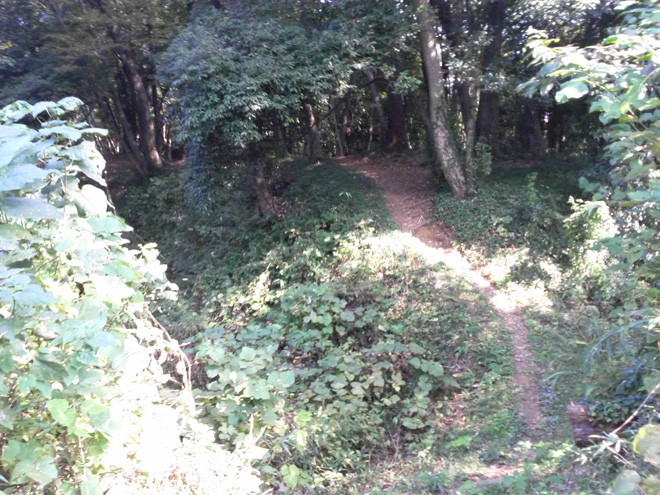 入城し曲輪4を右手に、まず空堀の滑らかさに感動する。若干土砂で堀が浅くなっているが当時はもっと深かったはずだ、卓偉の詞の意味と同じくらい。城の外に向けて土塁が高く盛られていることにも注目したい。曲輪4から三ノ曲輪に移動するにあたってまず、三ノ曲輪の土塁の高さに圧倒される。今は小さな土橋があって歩けるようになっているが当時はどうだったんだろうか?三ノ曲輪に登り右手に馬出し、目の前が二ノ曲輪がそびえるわけだが、この馬出しも両サイドが堀に囲まれておりはっきり言って本来の馬出しの使い方では機能してなかったと思う。三ノ曲輪と二ノ曲輪を守る為だけに作られた砦と言ったところか、長細い曲輪を奥に進めば太鼓曲輪にも接続される、この辺が防御としてよく考えられている。草や木が生え放題な状態だが、たまに草むらをかき分けるとそこには武蔵丘短期大学の校舎が見える、これがなんともエロい。かき分けた先の短大、かき分けた先が短大、かきむしってもきっとその先は短大、エロ過ぎる。