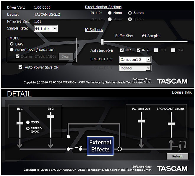 「TASCAM Software Mixer」は、DAWモードとBROADCAST/KARAOKEモードの2つのモードを用意。「US-4×4-SC」の場合、IN3/4はDAWモードでのみ有効となる。