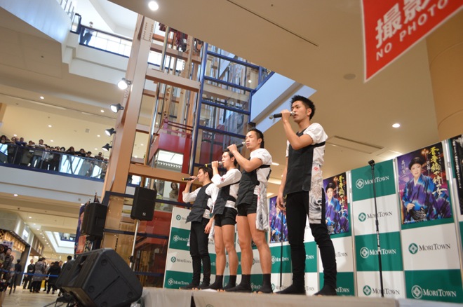 1月31日(日)当日、イベント会場である東京・モリタウン昭島に集まった約800人のファンは大いに盛り上がったという。東京力車はデビューシングルより「我ありて我思う」「俥気“おとこぎ”」の2曲を披露。現在、『武者修行の旅』と称してして全国各地のショッピングセンターを訪れている彼らは、ステージ狭しとパワフルなパフォーマンスで観客を魅了した。
