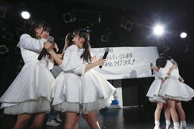 アンコール1曲目終了後、ステージ上でスタッフから会場にいるファンにいち早くワンマンライブの発表があり、メンバーへはサプライズでファンの口から知らせることに。会場にいるファンから「4月17日ラフォーレミュージアム原宿で単独ライブ決定!」が発表されるとメンバーは驚き、抱き合って喜びを表現した。