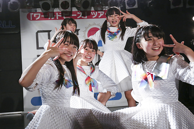 ロッカジャポニカはスターダストプロモーションが新たに送り出したアイドルユニットで、内山あみ、内藤るな、椎名るか、高井千帆、平瀬美里の5人組。デビューシングル「ワールドピース」を携え、“ウィークリー週ありがとう!ライブハウスでフリーイベント!!”と題されて行われた1日のイベントでは平日にも関わらず多くのファンがつめかけた。