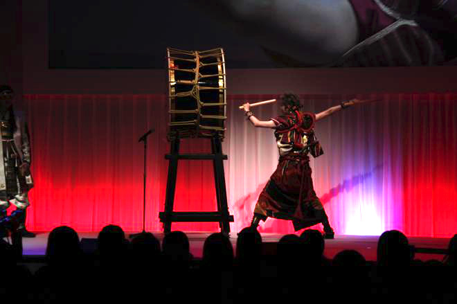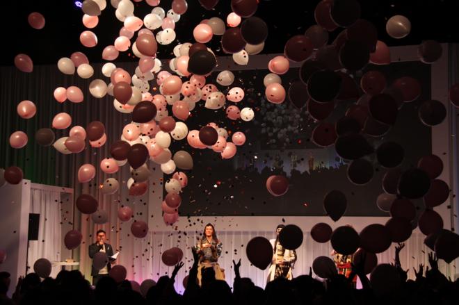 続いて、現在放送中の『「雷さま」篇』CMで太鼓の演奏姿を見せている菅田が太鼓演舞を披露。凛々しい表情とキレのあるバチさばきで、女性ファンはメロメロに。演舞後の菅田は息が上がっていたのだが、実は息を吸うのを忘れるほど緊張していたとのことだ。メインイベントの豆まきでは、「鬼は内」「福も内」「5ギガ ドッカーン!」の3回の掛け声で会場中央に吊るされた巨大風船へ向けて豆を投げつけることに。風船が割れるとたくさんの小さな風船と紙吹雪が飛び出し、大きな拍手が起こった。