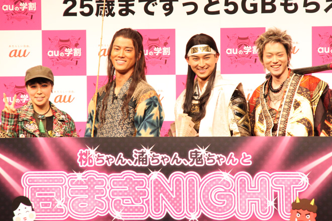 2月3日、東京都内某所にてKDDI株式会社が主催する<桃ちゃん、浦ちゃん、鬼ちゃんと豆まきNIGHT>が行なわれた。これはauの『三太郎シリーズ』CMに出演する松田翔太(桃ちゃん)、桐谷健太(浦ちゃん)、菅田将暉(鬼ちゃん)が登場した豆まきイベント。中学生以上の学生100組200名(保護者含む)が招待され、この日初公開の新CM『「もらえる行列」篇』の上映や、サプライズでAIが登場するなど、盛りだくさんの内容となった。