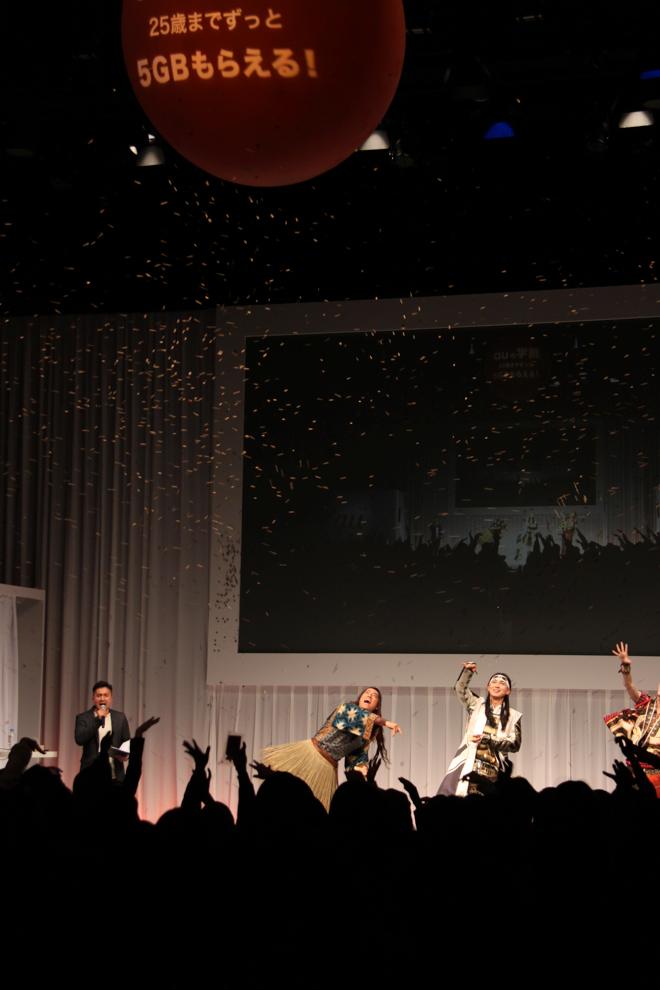 それからサプライズゲストとしてAIが登場。『「春のトビラ・みんながみんな英雄」篇』のCMソング「みんなみんな英雄」を歌い上げ、続く「ハピネス」ではダンサーも加わり、AIは「さあみなさん一緒にでっかい声で!」と声をかけ、会場と一緒にコーラスをして温かい空間を作り上げた。パフォーマンスのあとには改めて松田・桐谷・菅田を迎え、松田は「AIさんも仲間ということでプレゼントです」とCMにも登場した特大おにぎりを贈呈。AIは「初めてです、おにぎり贈呈って(笑)」と喜びに満ちた表情を見せた。