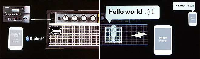 ▲ギターインプットは持たないが、AUDIO INにデスクトップ用マルチ・エフェクツGT-001などを接続すればギター演奏も(左)。スマホのハンズフリー通話にも(右)。