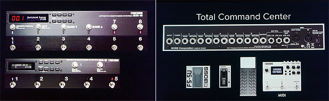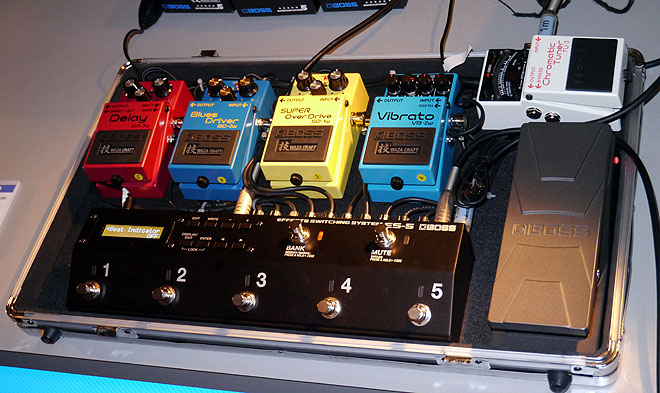 ▲5ループのコンパクトなプログラマブル・スイッチング・システムES-5(写真手前)は、ペダルボードにセットして展示。